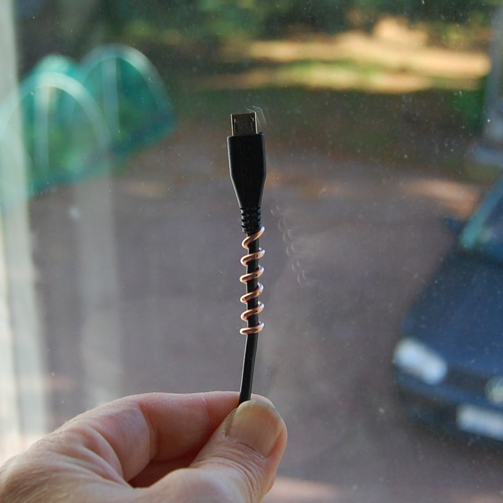 EN SPIRAL AV av lite grövre koppartråd, för att skydda t.ex. USB-kabelns kontaktändor från att med tiden drabbas av kabelbrott pga alla böjningar den får utstå; såväl enkelt att få till som utomordentligt funktionellt. Snyggt är det också! Varför har jag inte kommit på det här tidigare?